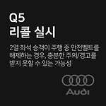 Q5 2열 좌석 안전띠 경고 장치 관련 리콜 차량관리 필수앱 마카롱 대상 차량 차종 제작 일자 Q5 40 TDI quattro/Premium 20.02.05 ~ 20.03.06 Q5 45 TFSI quattro/Premium 19.11.20 ~ 20.03.05 Q5 50 TDI quattro Premium 20.02.28 ~ 20.02.09 리콜 내용 좌석 안전 벨트 경고 기능 중 2열 좌석 경고 기능이 '자동차 및 자동차 부품의 성능과 기준에 관한 규칙' 제27조 4항(좌석안전띠 경고장치 설치 및 작동 기준 등)의 일부를 준수하지 않아 국내 자동차 안전 기준을 충족하지 않음이 확인되었고 이에, 2열 좌석 승객이 주행 중 안전벨트를 해제하는 경우, 청각적/시각적 경고로 충분한 주의/경고를 받지 못할 수 ..