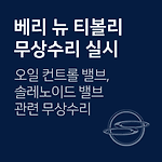 베리 뉴 티볼리 오일 컨트롤 / 솔레노이드 밸브 관련 무상수리 차량관리 필수앱 마이클 대상 차량 차종 제작 일자 티볼리(G1.5) 2019.05.15~2020.01.20 무상수리내용 정차조건에서 가변밸브제어시스템(CVVT)의 제어 부품 작동 성능 이상으로 인해, 주행 중 엔진경고등이 점등될 가능성에 따른 무상수리 조치사항개선된 부품으로 교환 (오일 컨트롤 밸브와 솔레노이드 밸브) 대상확인 080-500-5582 무상수리 기간2020-06-30 ~ 출처자동차 리콜센터 이제 '내 차 관리' 좀 해볼까? 친구에게 공유하기
