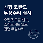 신형 코란도 오일 컨트롤 / 솔레노이드 밸브 관련 무상수리 차량관리 필수앱 마이클 대상 차량 차종 제작 일자 코란도(G1.5) 2019.07.23~2020.01.20 무상수리내용 정차조건에서 가변밸브제어시스템(CVVT)의 제어 부품 작동 성능 이상으로 인해, 주행 중 엔진경고등이 점등될 가능성에 따른 무상수리 조치사항개선된 부품으로 교환 (오일 컨트롤 밸브와 솔레노이드 밸브) 대상확인 080-500-5582 무상수리 기간2020-06-30 ~ 출처자동차 리콜센터 이제 '내 차 관리' 좀 해볼까? 친구에게 공유하기