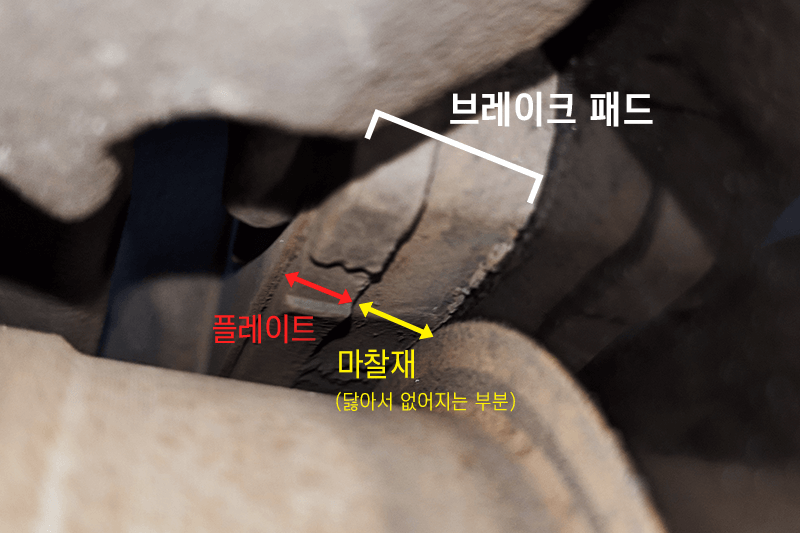 브레이크 플레이트보다 마찰재가 비슷하거나 3mm 미만으로 남았다면 패드를 교체해야합니다.
