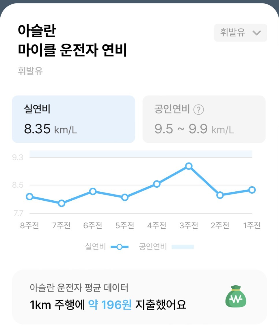 마이클을 이용하는 실제 올 뉴 모닝 오너들의 연비는 최근 30일 기준 8.35km/L로 1Km 주행에 약 196원을 지출하는 것으로 나타났습니다.
