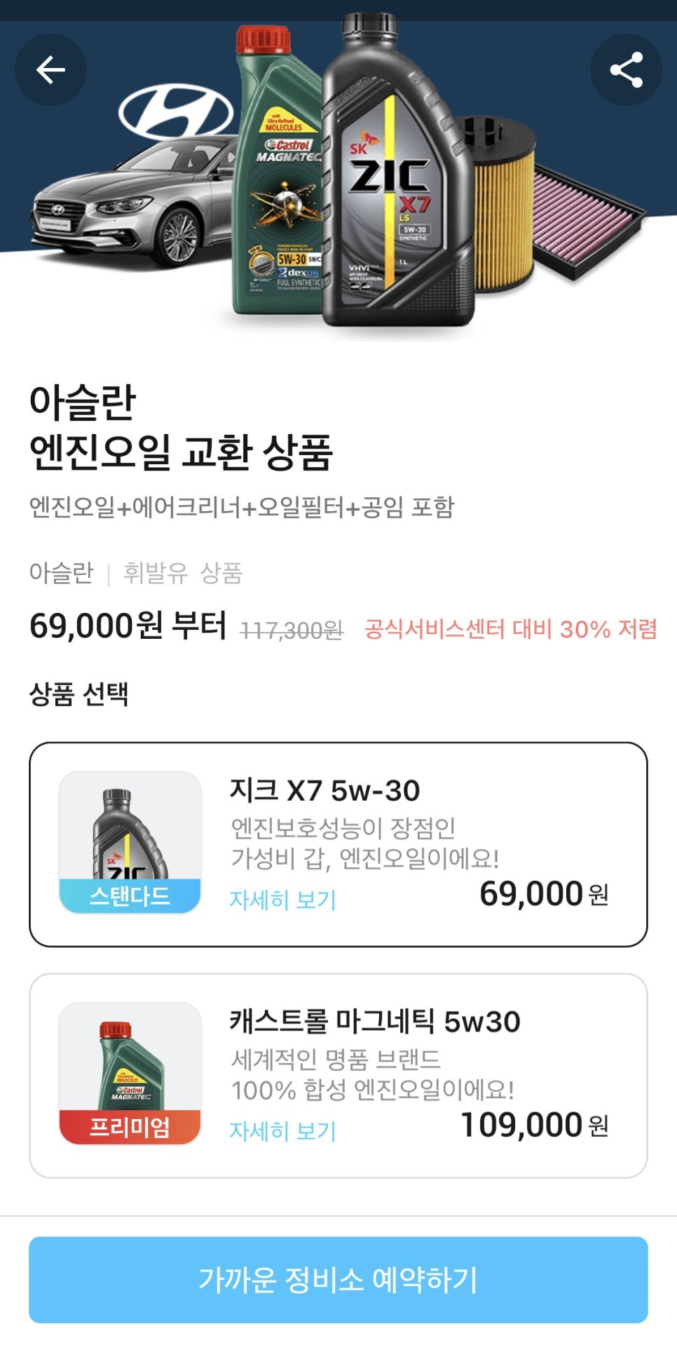 프리미엄 엔진오일, 캐스트롤 엔진오일도 제공하고 있으니, 원하시는 엔진오일을 선택하실 수 있어요!