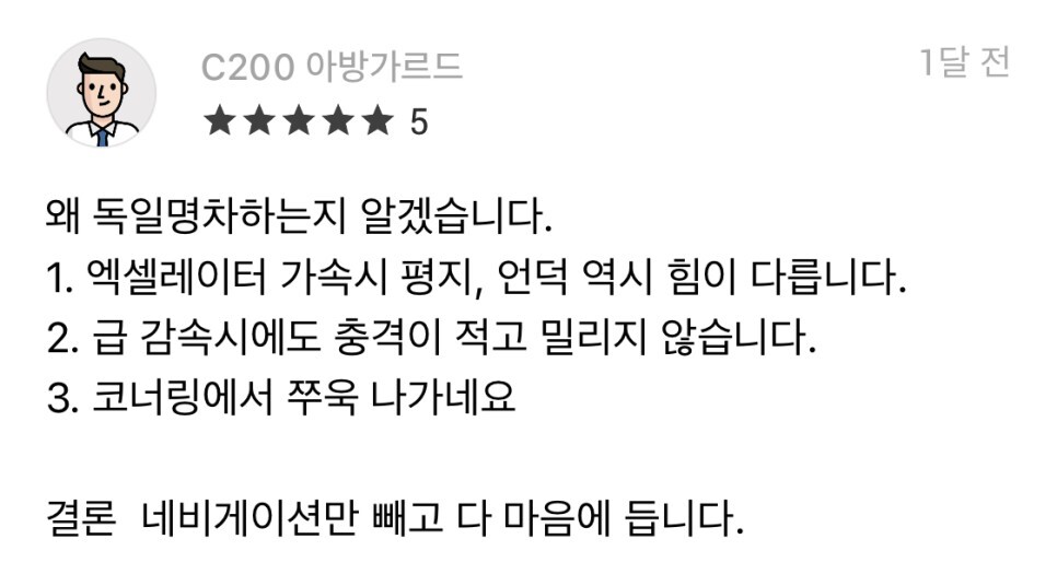 C클래스의 단점으로 내비게이션을, 장점으로 고속안전성과 주행감을 꼽아주셨네요.