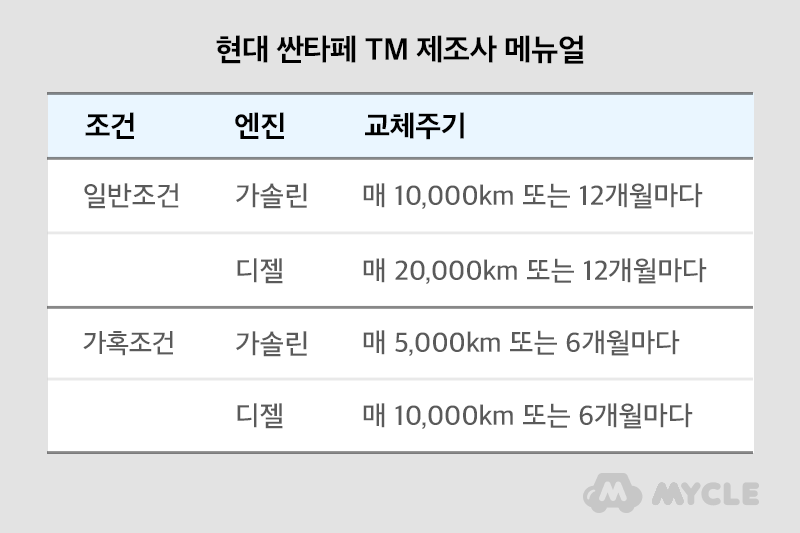 그런데 매뉴얼을 보면 일반조건과 가혹 조건에 따라 엔진오일 교체주기가 다르게 표시되는데요. 가혹 조건이란 엔진에 무리가 가는 주행 환경이라 엔진오일이 일반조건보다 빠르게 오염되는 조건을 말합니다. 때문에 가다서다 반복을 많이 하는 도심 주행, 엔진에 흙먼지가 자주 들어가는 산간지역 주행이 많은 운전자라면 가혹 조건에 맞게 엔진오일 교체주기를 더 빠르게 가져가야겠죠?