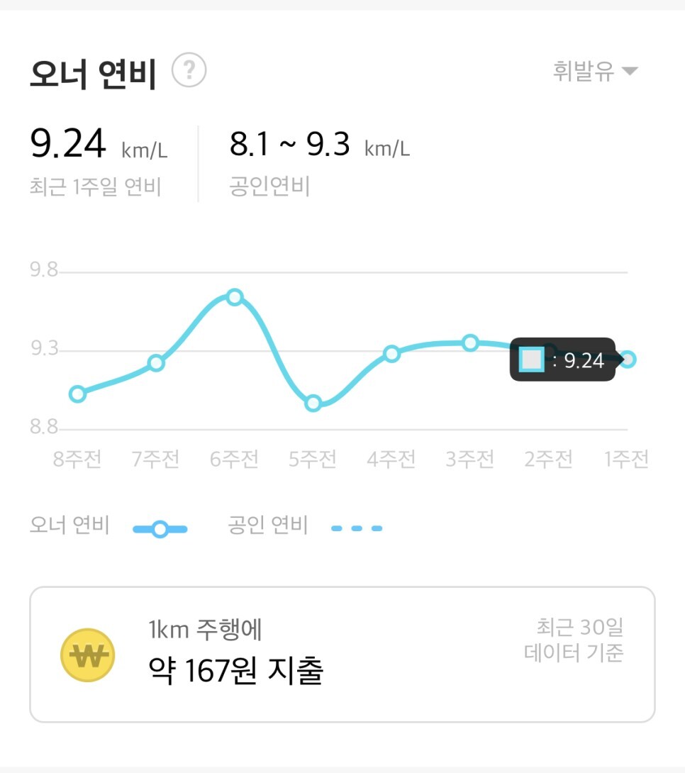 마이클을 이용하는 실제 올 뉴 모닝 오너들의 연비는 최근 30일 기준 9.24km/L로 1Km 주행에 약 167원을 지출하는 것으로 나타났습니다.