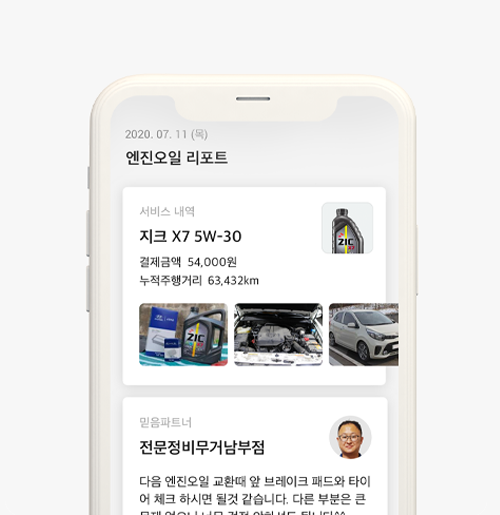 자동으로 기록 된 정비내역을 바탕으로 다음 엔진오일 교체시기가 도래하면 자동으로 알림을 보내드려요.