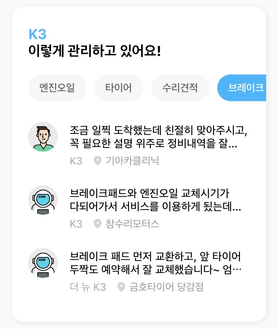 브레이크 패드부터 엔진오일, 타이어, 엔진오일, 외장수리부터 다양한 후기를 볼 수 있답니다.