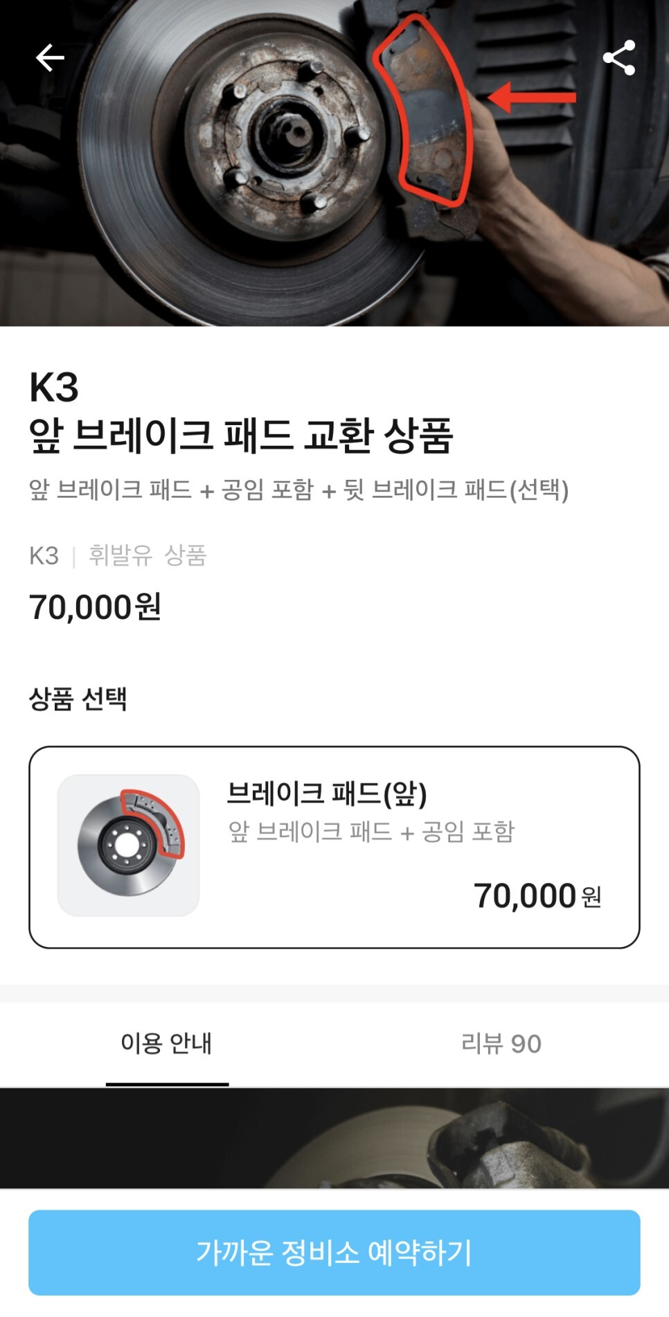 마이클에서 제공하고 있는 K3 브레이크패드 교체비용은 70,000원이네요!