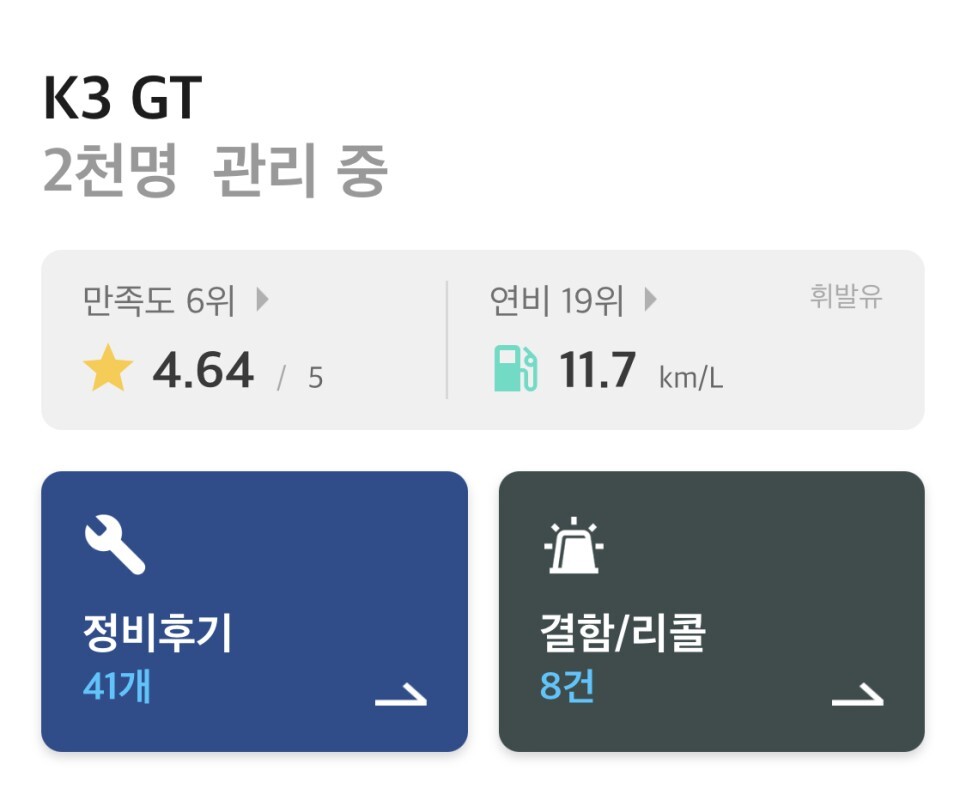 현재 차량관리앱 마이클을 통해 K3 GT를 관리하고 있는 운전자는 대략 2천명입니다.