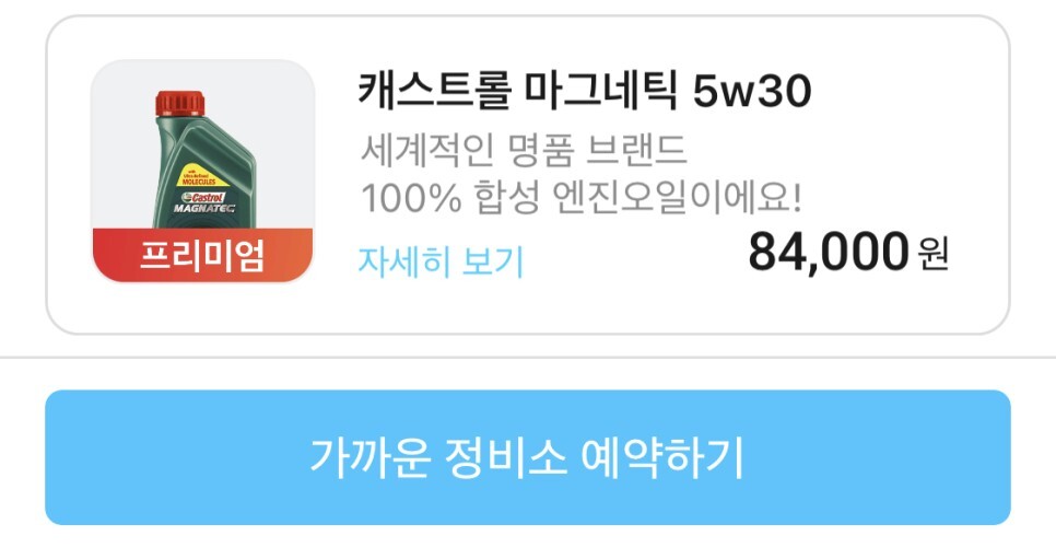 프리미엄 엔진오일, 캐스트롤 엔진오일도 제공하고 있으니, 원하시는 엔진오일을 선택하실 수 있어요!