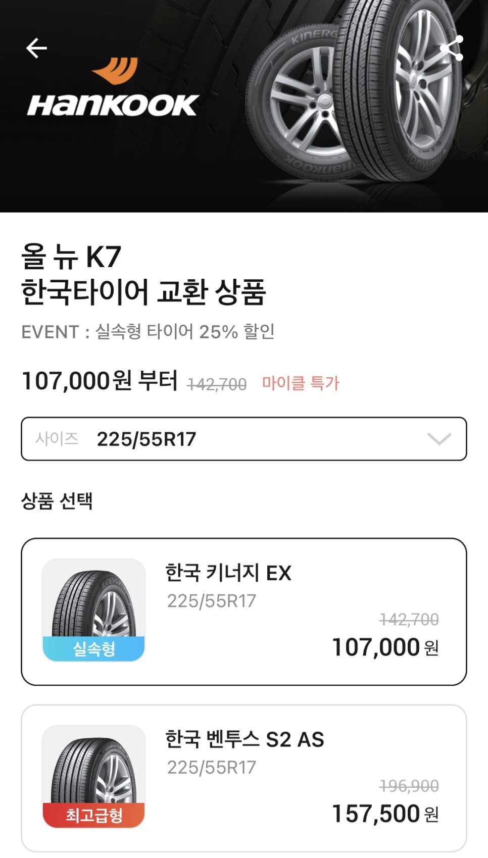 마이클앱에서 마이클과 한국타이어, 금호타이어가 함께 하는 타이어 특가를 만나보실 수 있는데요.