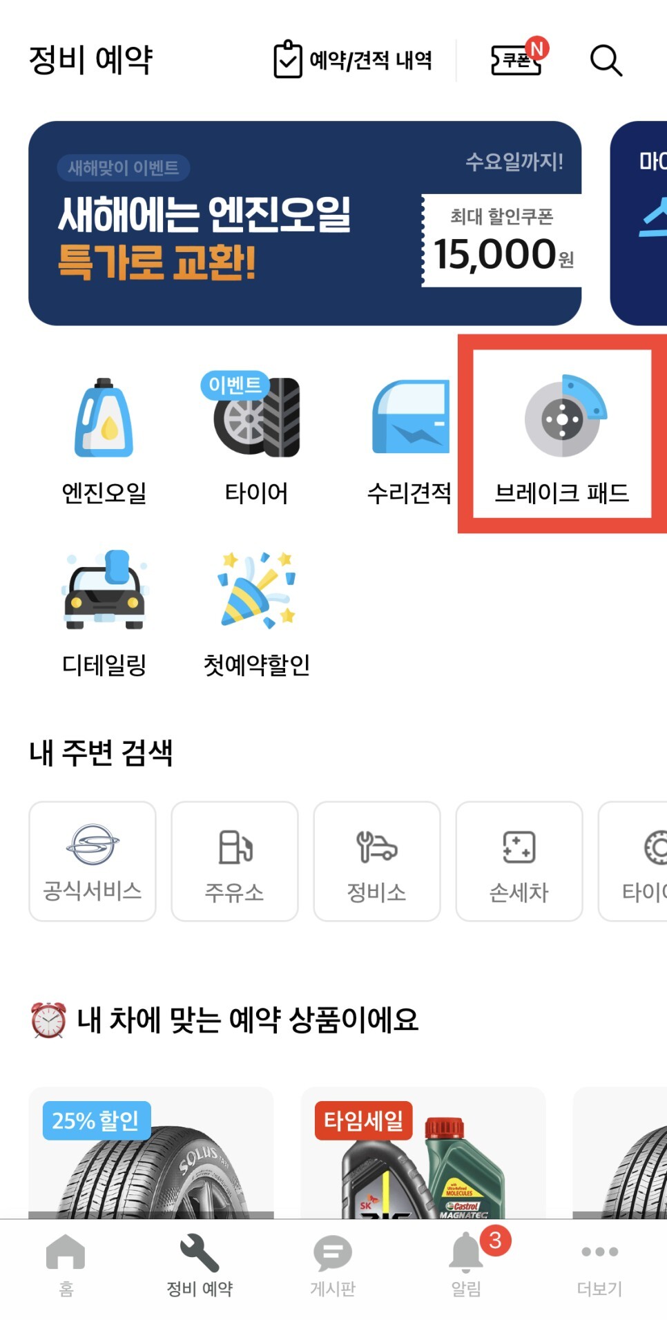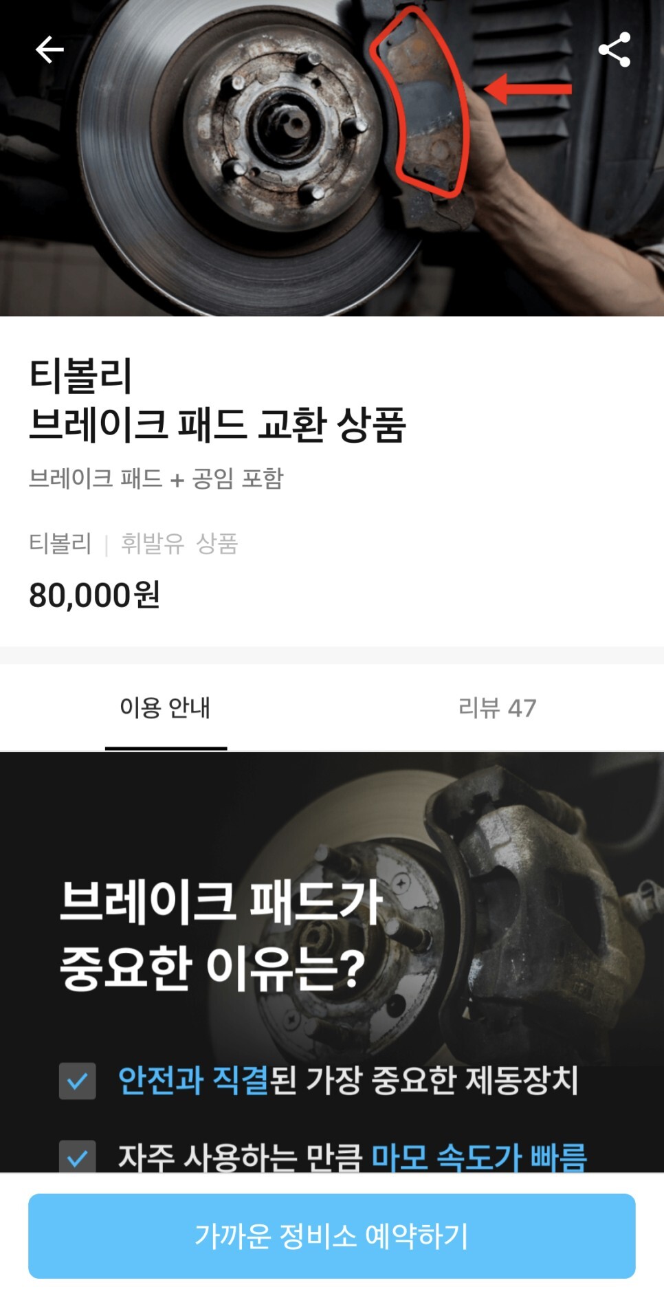 정비예약탭에서 '브레이크패드'를 선택하시면
