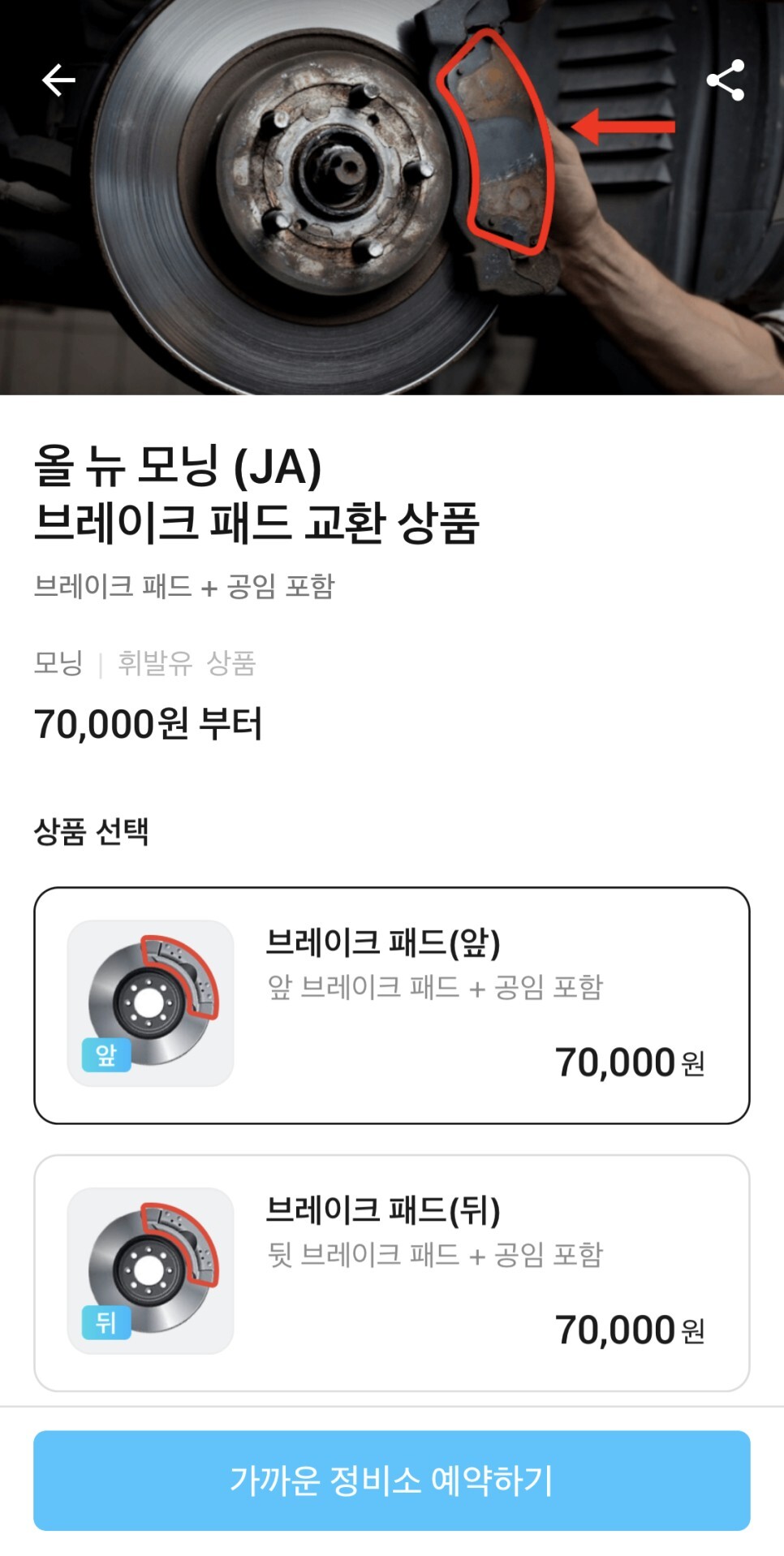 마이클에서 제공하고 있는 모닝 브레이크패드 교체비용은 70,000원이네요!