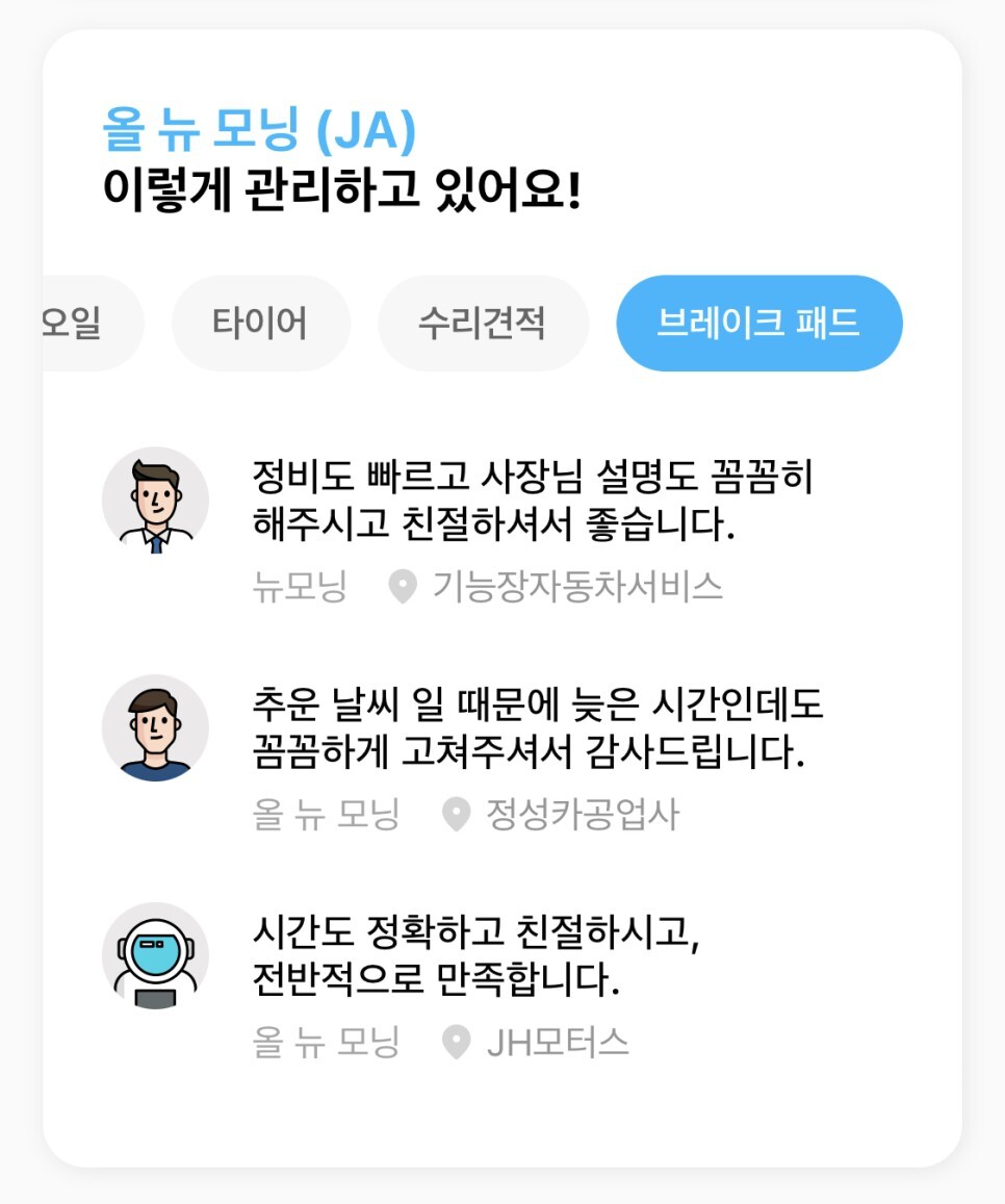 브레이크 패드부터 엔진오일, 타이어, 엔진오일, 외장수리부터 다양한 후기를 볼 수 있답니다.