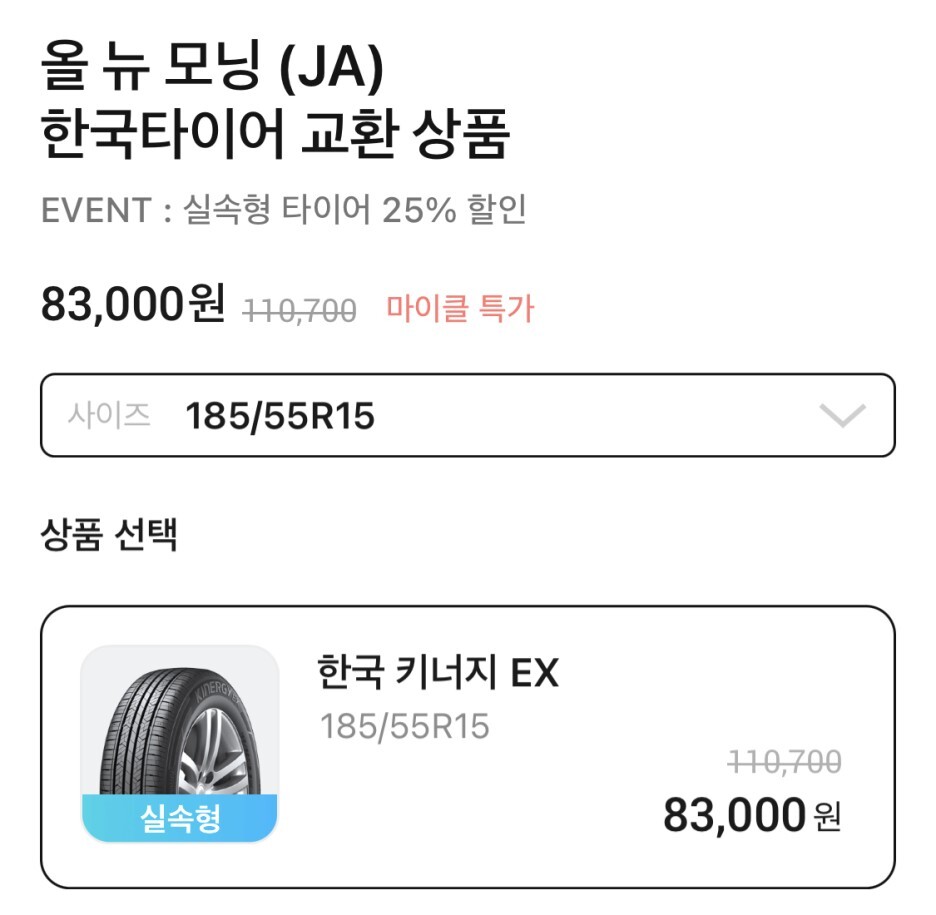 올 뉴 모닝 타이어 가격은 83,000원입니다.