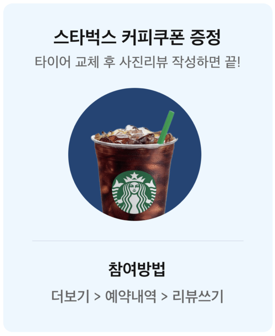 타이어 교체 후 마이클 앱에 내 차 타이어 교체 후기를 남기면 100% 스타벅스 커피쿠폰을 증정해드려요!