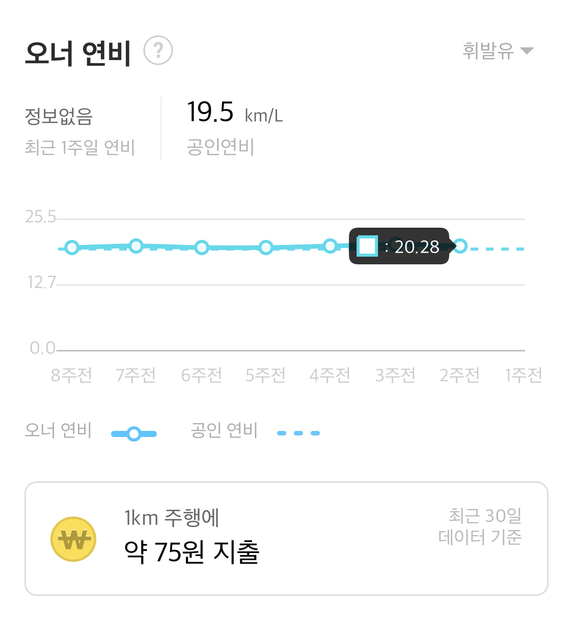 마이클을 이용하는 실제 니로 오너들의 연비는 최근 30일 기준 19.5km/L로 1Km 주행에 약 75원을 지출하는 것으로 나타났습니다.
