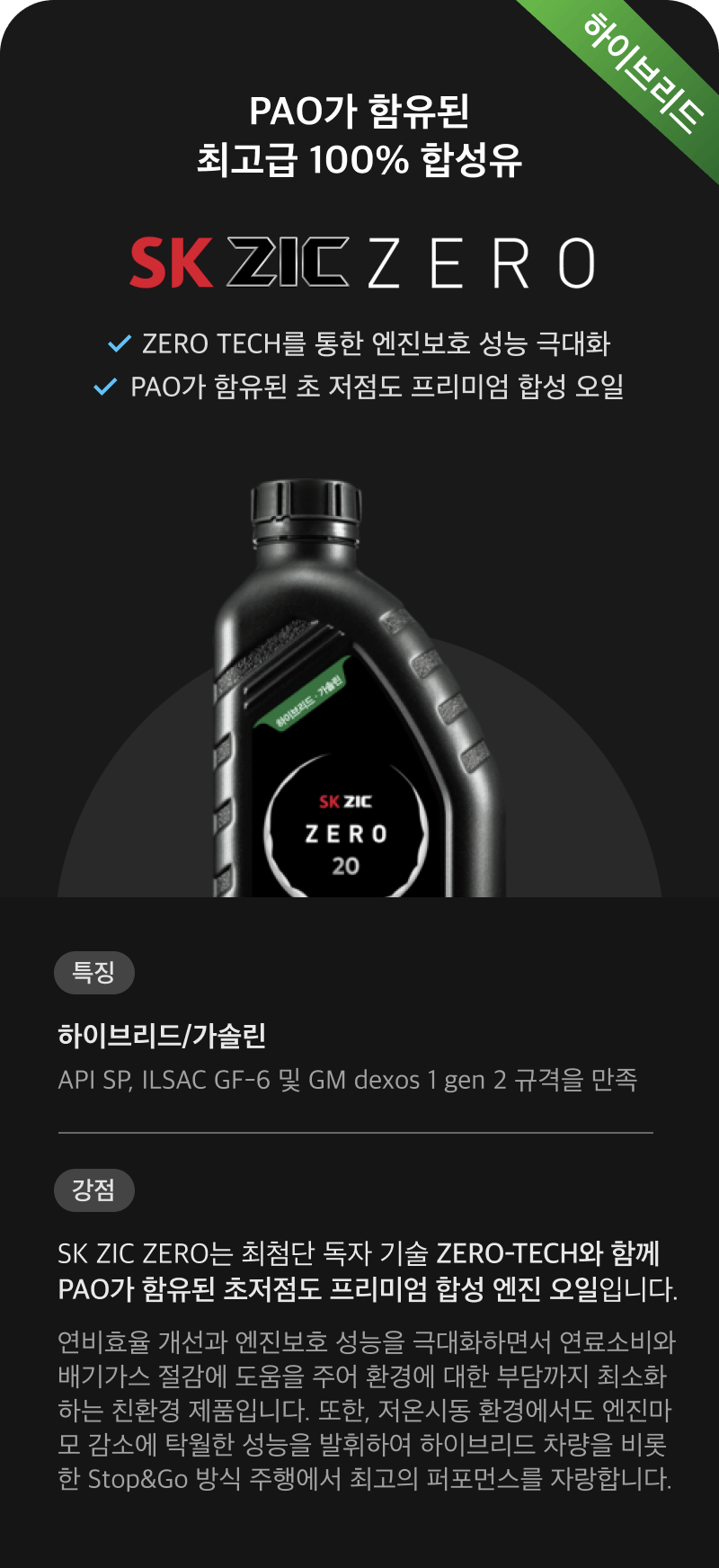 국내 최고 윤활유 브랜드 루브리컨츠의 하이브리드 전용! 지크제로 엔진오일과 글로벌 브랜드 보쉬의 에어크리너, 오일필터를 사용한답니다.