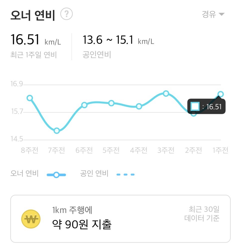 마이클을 이용하는 실제 폭스바겐 파사트GT 오너들의 연비는 최근 30일 기준 16.51km/L로 1Km 주행에 약 90원을 지출하는 것으로 나타났습니다.