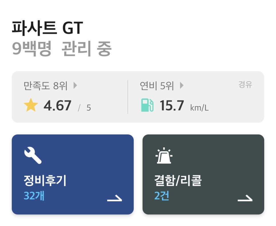 현재 차량관리앱 마이클을 통해 파사트 GT를 관리하고 있는 운전자는 대략 9백명입니다.