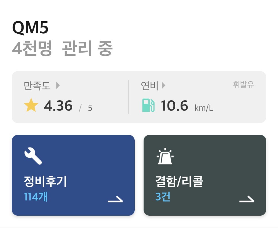 현재 차량관리앱 마이클을 통해 QM5를 관리하고 있는 운전자는 대략 4천명입니다.