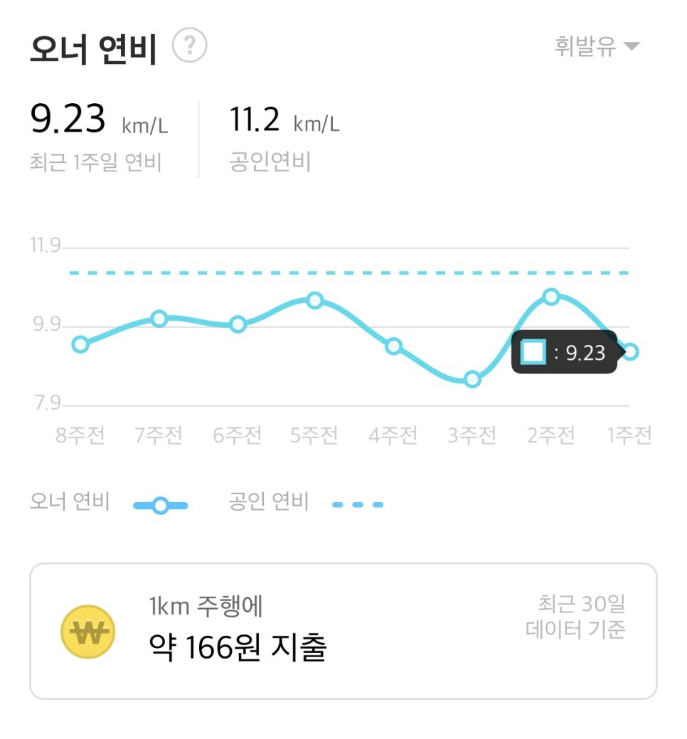 마이클을 이용하는 실제 QM5 오너들의 연비는 최근 30일 기준 11.2km/L로 1Km 주행에 약 166원을 지출하는 것으로 나타났습니다.