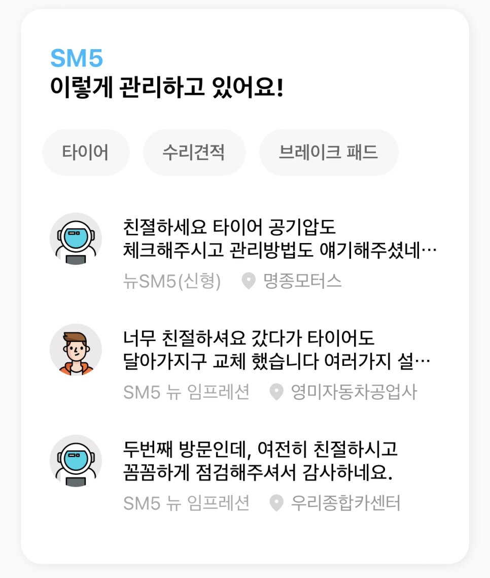브레이크 패드부터 엔진오일, 타이어, 엔진오일, 외장수리부터 다양한 후기를 볼 수 있답니다.