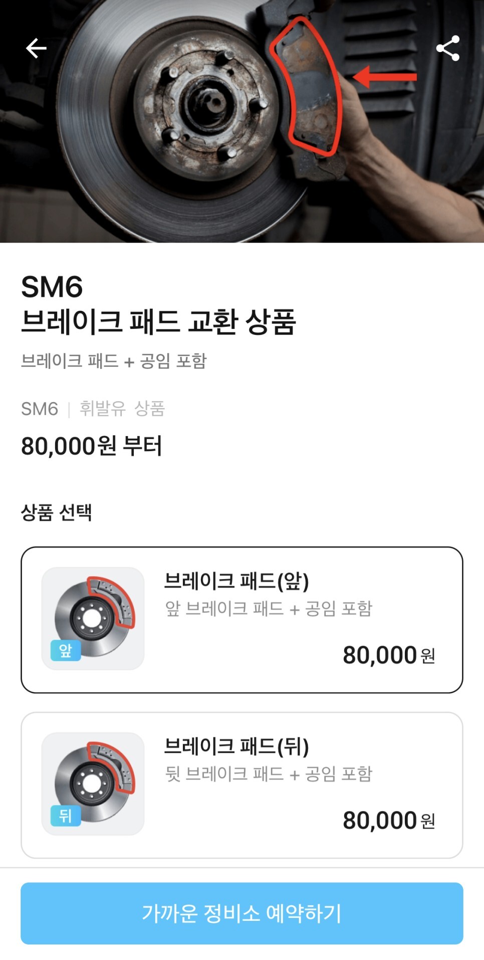 마이클에서 제공하고 있는 SM6 브레이크패드 교체비용은 80,000원이네요!