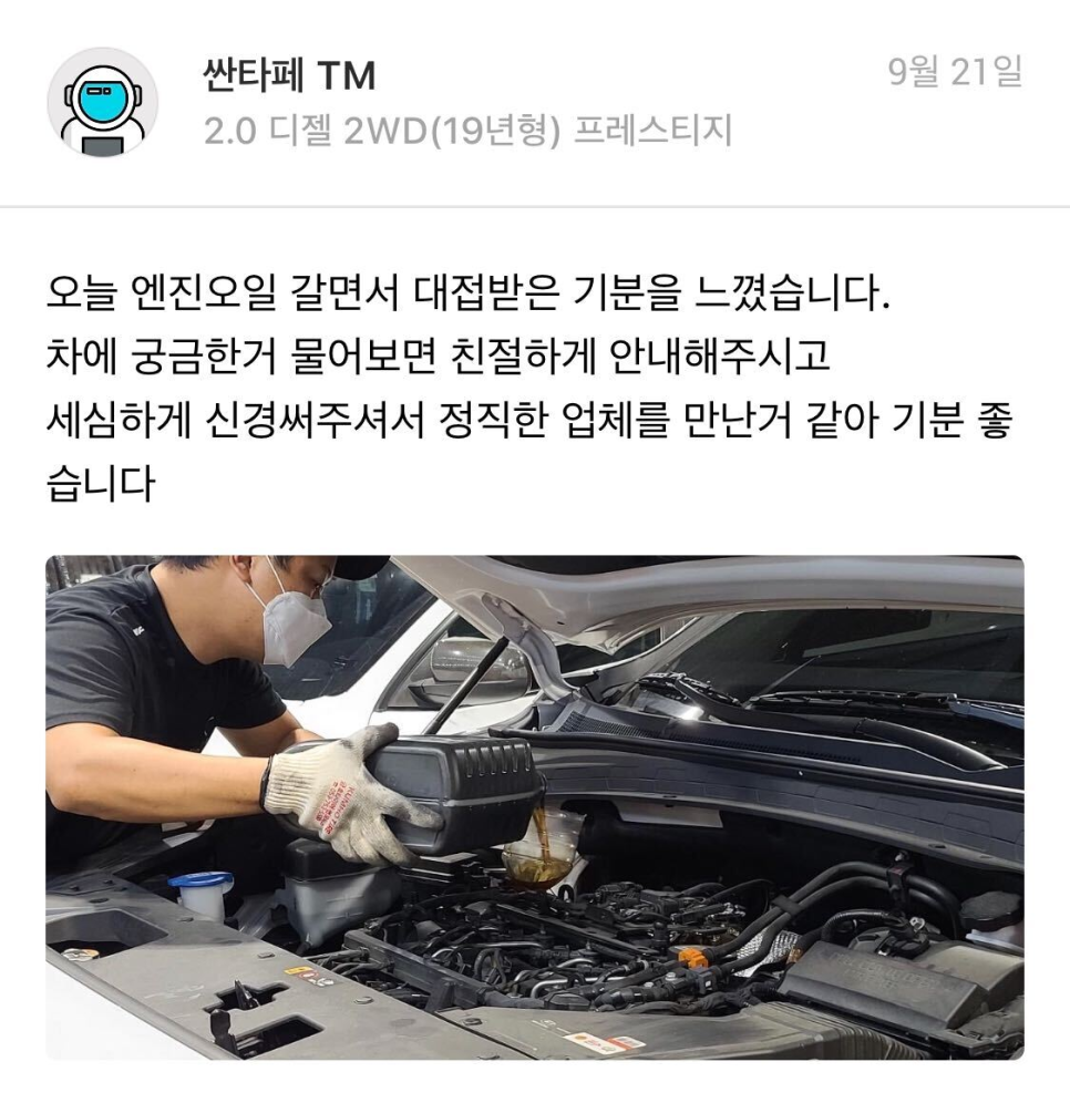 "오늘 엔진오일 갈면서 대접받은 기분을 느꼈습니다. 차에 궁금한거 물어보면 친절하게 안내해주시고 세심하게 신경써주셔서 정직한 업체를 만난 것 같아 기분 좋습니다."
