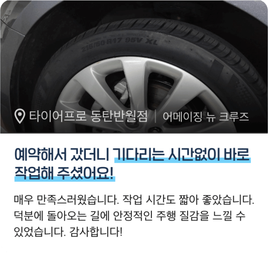 대부분 6개월 이내의 최신 타이어로 시공을 도와드리고 있습니다!