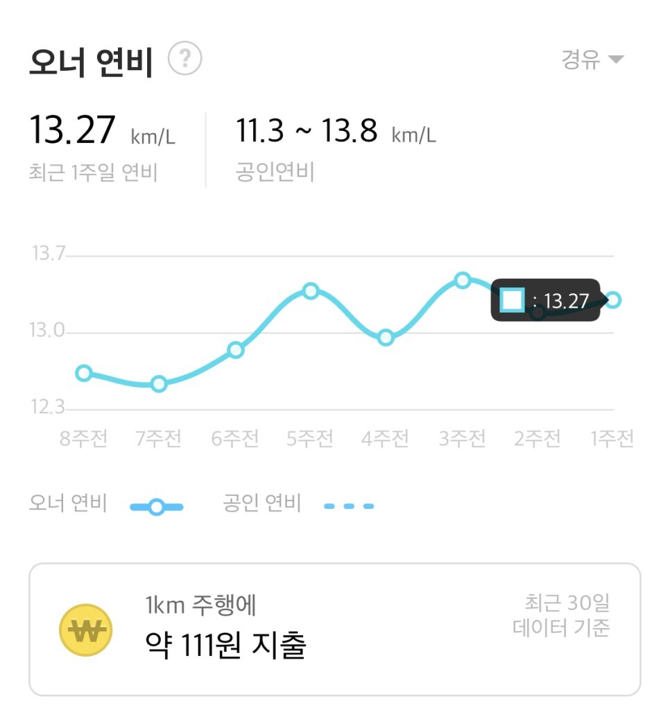 마이클을 이용하는 실제 더 뉴 쏘렌토 오너들의 연비는 최근 30일 기준 13.27km/L로 1Km 주행에 약 111원을 지출하는 것으로 나타났습니다.
