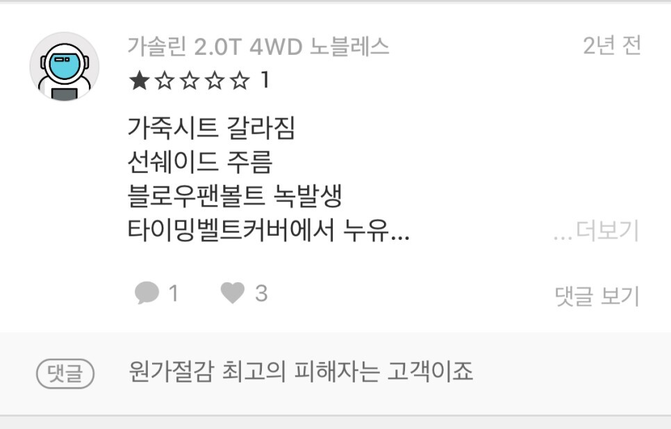 더 뉴 쏘렌토의 단점으로 내장재를 장점으로 높은 연비와 넓은 내부 공간을 꼽아주셨네요!