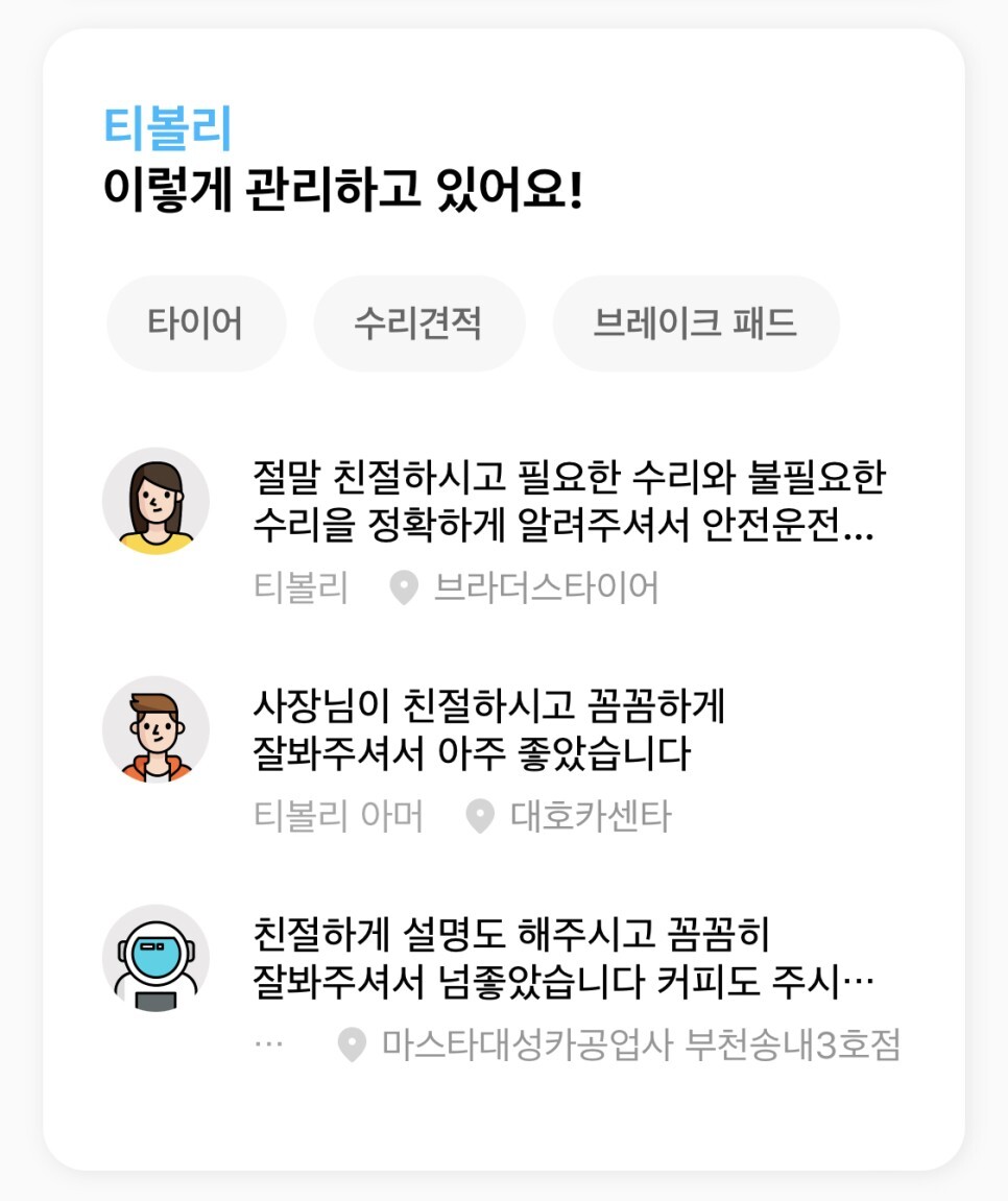 브레이크 패드부터 엔진오일, 타이어, 엔진오일, 외장수리부터 다양한 후기를 볼 수 있답니다.