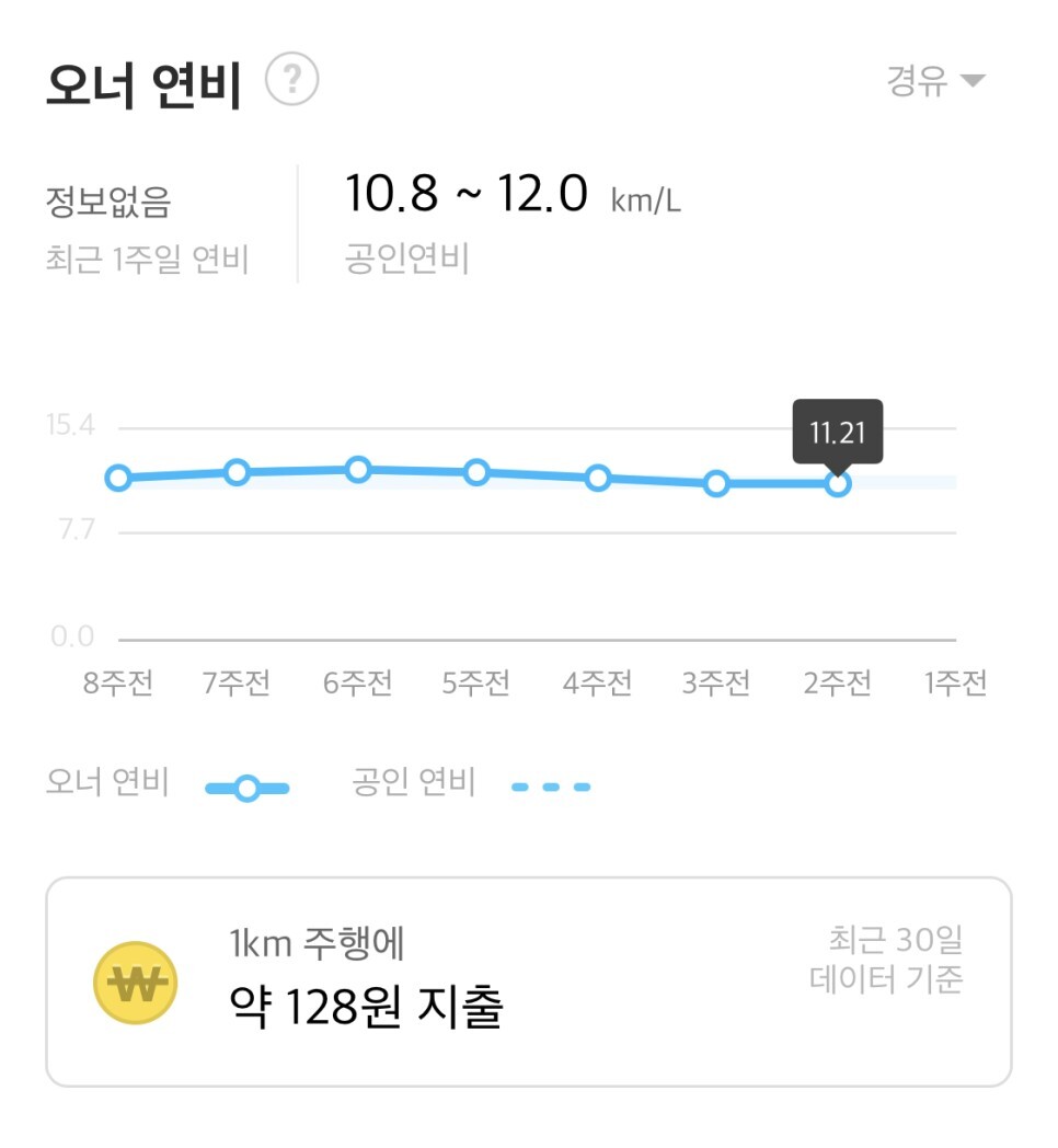 마이클을 이용하는 실제 캡티바 오너들의 연비는 최근 30일 기준 11.21km/L로 1Km 주행에 약 128원을 지출하는 것으로 나타났습니다.