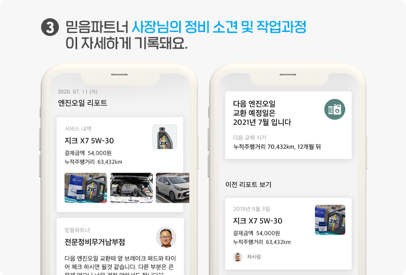 마이클을 통해 엔진오일 교환 서비스를 받으면 믿음파트너 사장님의 정비소견 및 정비 내역 사진이 자동으로 앱에 기록되어요.