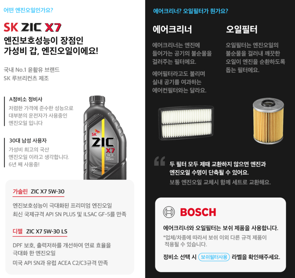 국내 최고 윤활유 브랜드 루브리컨츠의 지크 X7 엔진오일과 글로벌 브랜드 보쉬의 에어크리너, 오일필터를 사용한답니다.