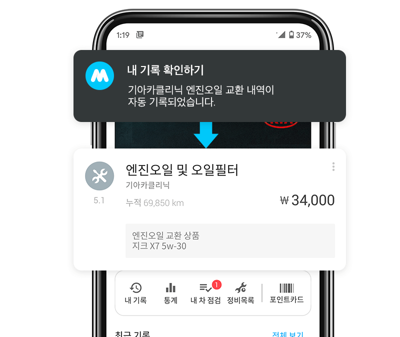 자동으로 기록 된 정비내역을 바탕으로 다음 엔진오일 교체시기가 도래하면 자동으로 알림을 보내드려요.