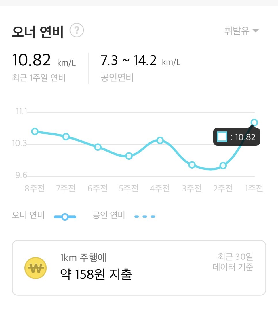 마이클을 이용하는 실제 E클래스 오너들의 연비는 최근 30일 기준 10.82km/L로 1Km 주행에 약 158원을 지출하는 것으로 나타났습니다.