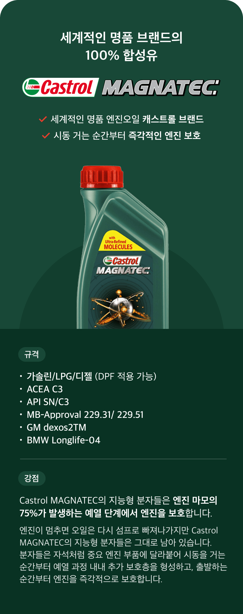 세계적인 명품 엔진오일 브랜드 캐스트롤 마그네틱을 사용하고 있습니다.