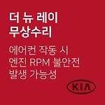더 뉴 레이 엔진 RPM 불안전 발생 가능성에 따른 무상수리 차량관리 필수앱 마카롱 대상 차량 기아 자동차 차종 제작 일자 더 뉴 레이 '17.09.29. ~ '18.08.16. 무상점검 내용 에어컨 작동 토크 보상 로직 미흡으로 에어컨 작동 상태에서 후진(R단) 시 엔진 RPM 불안전 발생 가능성에 따른 무상수리 조치사항 ECU 업그레이드 대상확인 080-200-2000 무상수리 개시일2018년 09월 14일 ~ 2019년 09월 13일 출처기아자동차 이제 '내 차 관리' 좀 해볼까? 친구에게 공유하기