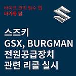 스즈키 GSX, BURGMAN 전원공급장치 관련 리콜 실시 리콜대상 BURGMAN400 137대 (2007.9.3 ~ 2011.2.7 생산) GSX1300R 230대 (2007.9.13 ~ 2011.9.13 생산) GSX-R600 48대 (2008.1.9 ~ 2010.3.24 생산) GSX1300BK/A 32대 (2007.10.18 ~ 2007.12.26 생산) GSX-R750 38대 (2008.2.8 ~ 2010.03.30 생산) GLADIUS650 25대 (2009.7.29 ~ 2010.10.23 생산) GSR600A 18대 (2009.8.10 ~ 2010.4.27 생산) 결함내용 전원공급장치 불량 > 관련 부품 교체 배터리가 방전되어 시동이 걸리지 않거나 주행 중 엔진이 멈출 가능성 서비스 기간 2..