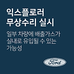 익스플로러 배기가스 실내유입 관련 무상수리 차량관리 필수앱 마카롱 대상 차량 포드 코리아 차종 제작 일자 무상수리기간 Explorer ‘10.10.13 ~ 15.04.28. ‘19.03.31 까지 Explorer ‘15.04.08 ~ 17.09.29. ‘19.12.30 까지 무상수리 내용 일부 차량에 배출가스가 실내로 유입될 수 있는 가능성에 따른 무상수리 조치사항 대상 차량 후방 실링 보강, 실내공기 익스트렉터 교체, 리프트게이트 드레인 밸브 교체 및 에어컨디셔닝 시스템 리프로그래밍 실시 대상확인 1600-6003 출처www.car.go.kr (자동차 리콜센터) 이제 '내 차 관리' 좀 해볼까? 친구에게 공유하기