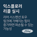 포드 익스플로러 리어 서스펜션 토우 링크 관련 리콜 차량관리 필수앱 마카롱 대상 차량 포드 코리아 차종 제작 일자 Explorer ‘10.05.26.∼’17.01,24. 리콜 내용 리어 서스펜션 토우 링크에 가해지는 힘이 증가하면 파손될 수 있는 가능성 험한 도로에서 잦은 극심한 진동 및 튀어오르는 증상으로 리어 서스펜션 토우 링크에 가해지는 힘이 증가하면 파손될 수 있는 가능성에 따른 리콜 시정방법 대상차량 확인 후, 개선된 리어 서스펜션 토우 링크 교체 대상확인 1600-6003 리콜 개시일2019년 02월 15일 ~ 출처www.car.go.kr (자동차 리콜센터) 이제 '내 차 관리' 좀 해볼까? 친구에게 공유하기