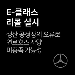 E-클래스 연료호스 사양 관련 리콜 차량관리 필수앱 마카롱 대상 차량 차종 제작 일자 E-Class 220 d '15.12.23. ~ '17.08.31. E-Class 220 d Coupe '16.11.09.∼'17.11.27. E-Class 220 d Cabriolet '17.04.12.∼'17.11.30. E-Class 220 d 4MATIC '16.09.21.∼'17.08.31. 리콜 내용 해당 기간 중 특정 생산 공정상의 오류로 인해 특정 대상 차량의 4기통 디젤엔진에 연결된 연료호스의 위치가 사양을 충족시키지 못할 가능성에 따른 리콜 시정 방법 연료 호스의 위치 점검 및 필요 시 교체 대상확인 080-001-1886 리콜 개시일2018년 12월 05일 출처자동차 리콜센터 이제 '내 차 관리' 좀..