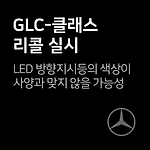 GLC-클래스 LED 방향지시등 관련 리콜 차량관리 필수앱 마카롱 대상 차량 차종 제작 일자 GLC-class 220 d 4MATIC Coupe '18.02.26. ~ '18.05.07. GLC-Class 220 d 4MATIC '18.02.28.∼'18.04.11. GLC-Class 350 e 4MATIC '18.02.26.∼'18.04.06. 리콜 내용 헤드램프 공급업체의 제조상 오류로 헤드램프의 LED 방향지시등의 색상이 현재 사양과 맞지 않을 수 있는 가능성에 따른 리콜 시정 방법 헤드램프의 LED 방향지시등 색상을 확인 후 필요시 교체 대상확인 080-001-1886 리콜 개시일2018년 10월 26일 출처자동차 리콜센터 이제 '내 차 관리' 좀 해볼까? 친구에게 공유하기