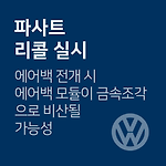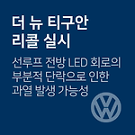 티구안 LED 조명 모듈 관련 리콜 차량관리 필수앱 마카롱 대상 차량 차종 제작 일자 티구안 2.0 TDI '18.03.03.∼'18.07.06. 티구안 2.0 TDI 4M '18.03.15.∼'18.07.04. 티구안 2.0 TDI Allspace '18.03.20.∼'18.07.07. 리콜 내용 특정 기간 내에 생산된 차량에 장착된 파노라마 선루프 LED 모듈에서 수분 영향(우천 시 개방)으로 인해 선루프 전방 LED 조명 모듈 내부 회로에 부분적인 단락이 발생하여, 이로인해 LED 조명 모듈에 과열이 발생할 수 있는 가능성에 따른 리콜 시정 방법 LED 모듈 연결 커넥터(퓨즈) 추가 설치 (회로 단락 시 발생하는 과전류를 LED 모듈로 흐르는 것을 방지) 대상확인 080-767-0089 리콜 개시일..